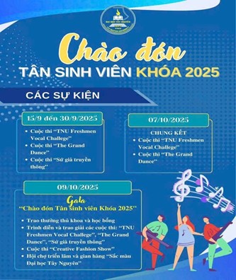 Bước vào năm học mới 2025 – 2026, Trường Đại học Tây Nguyên chào đón tân sinh viên bằng chuỗi sự kiện sôi động, sáng tạo và đầy sắc màu, tạo không gian gắn kết, lan tỏa tinh thần trẻ trung, khởi đầu hành trình tri thức mới. Với tinh thần chu đáo – sáng tạo – gắn kết, Trường Đại học Tây Nguyên, dưới sự chỉ đạo của Ban Giám hiệu và sự phối hợp tổ chức của Đoàn Thanh niên – Hội Sinh viên, đã chuẩn bị một chuỗi hoạt động hấp dẫn, sôi nổi và mang đậm dấu ấn tuổi trẻ để chào đón tân sinh viên khóa 2025 đến với “ngôi nhà chung” TNU. Các chương trình như Freshmen Vocal Challenge, The Grand Dance, Creative Fashion Show hay Sứ giả truyền thông tạo nên sân chơi bổ ích, nơi các bạn trẻ được thỏa sức thể hiện tài năng ca hát, nhảy múa, trình diễn thời trang tái chế và khả năng lan tỏa thông điệp tích cực trên mạng xã hội.