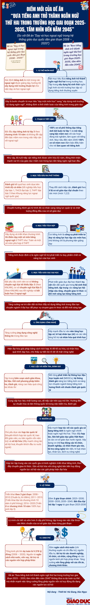 So với Đề án “Dạy và học ngoại ngữ trong hệ thống giáo dục quốc dân giai đoạn 2008–2020” (theo Quyết định 1400/QĐ-TTg năm 2008), Đề án “Đưa tiếng Anh thành ngôn ngữ thứ hai trong trường học giai đoạn 2025-2035, tầm nhìn đến năm 2045” (theo Quyết định 2371/QĐ-TTg năm 2025) đã mở ra bước chuyển mạnh mẽ khi xác định tiếng Anh trở thành ngôn ngữ thứ hai trong trường học, đặt ra yêu cầu sử dụng tiếng Anh rộng rãi trong dạy-học, giao tiếp và quản lý giáo dục, đồng thời xây dựng hệ sinh thái ngôn ngữ tiếng Anh trong các cơ sở giáo dục.