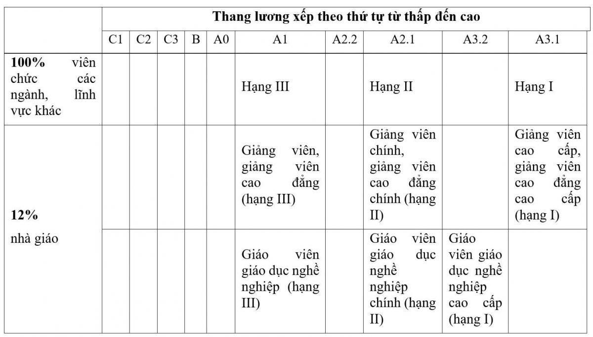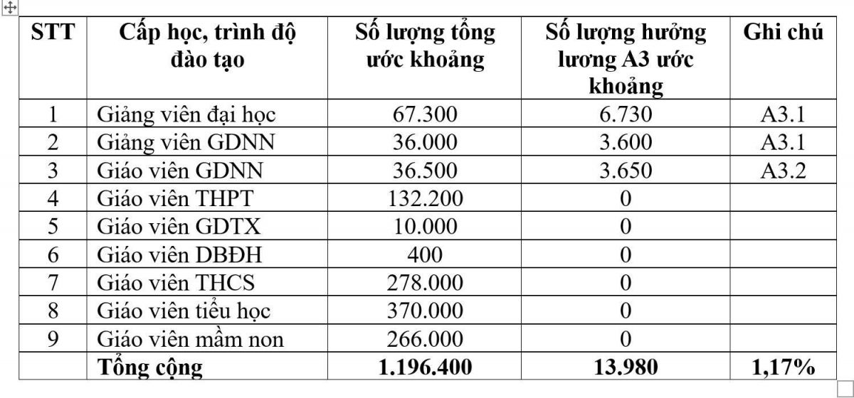 Trong số đó, chỉ có tối đa 1,17% nhà giáo cao cấp (hạng I) được xếp thang lương cao nhất (gồm A3.1 và A3.2), trong khi ngành khác đều có tối đa 10% viên chức được xếp thang lương A3.1.