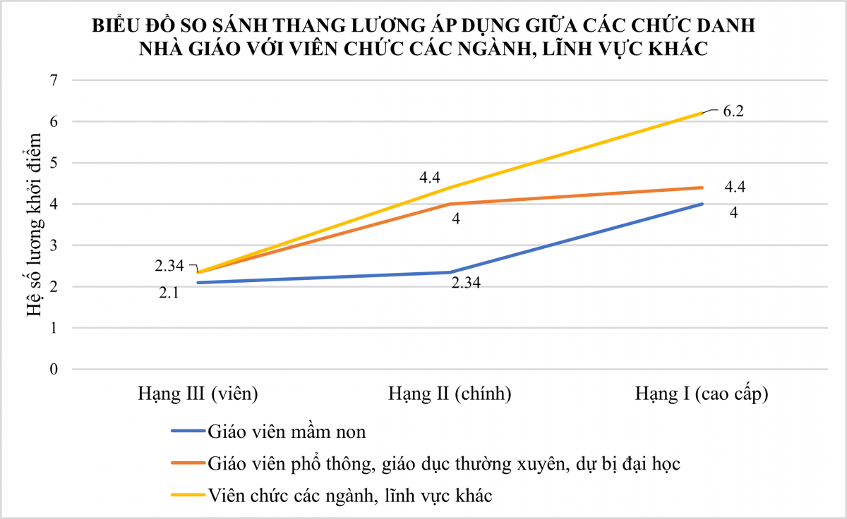 Hệ số khởi điểm của giáo viên mầm non hạng I là 4,0 trong khi các chức danh hạng I của viên chức ngành khác khác là 6,2 (cao gấp khoảng 1,55 lần);