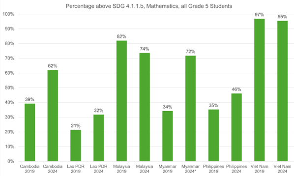 Việt Nam có tỷ lệ học sinh đạt mức năng lực tối thiểu cao nhất so sánh với Mục tiêu phát triển bền vững ở lĩnh vực Đọc hiểu (86%) và Toán học (95%) theo kết quả ở chu kỳ 2024.
