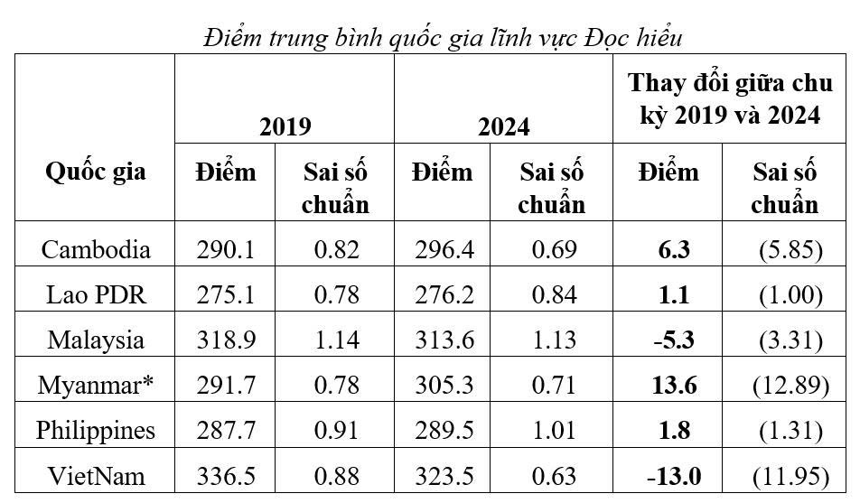 Ở chu kỳ 2024, học sinh lớp 5 Việt Nam tiếp tục đạt điểm cao nhất ở lĩnh vực Đọc hiểu với điểm trung bình là 323,5 điểm (giảm khoảng 3,86% so với chu kỳ 2019).