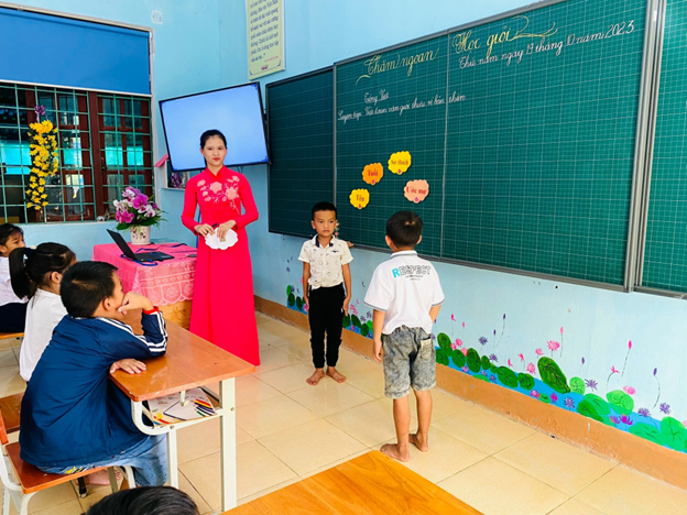 Cô Nguyễn Thị Huyền và các học trò trong giờ học giới thiệu về bản thân. (Ảnh: NVCC)