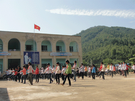 Hoạt động thể dục giữa của học sinh Trường Phổ thông Dân tộc bán trú Tiểu học và Trung học cơ sở Đồng Văn (Bình Liêu). Ảnh: Báo Quảng Ninh