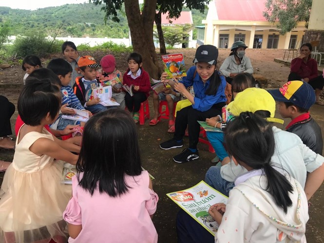 Thư viện lưu động tại Trường Phổ thông Dân tộc Bán trú Tiểu học và Trung học Cơ sở Bùi Thị Xuân, xã Ea Sin, huyện Krông Búk, tỉnh Đắk Lắk.